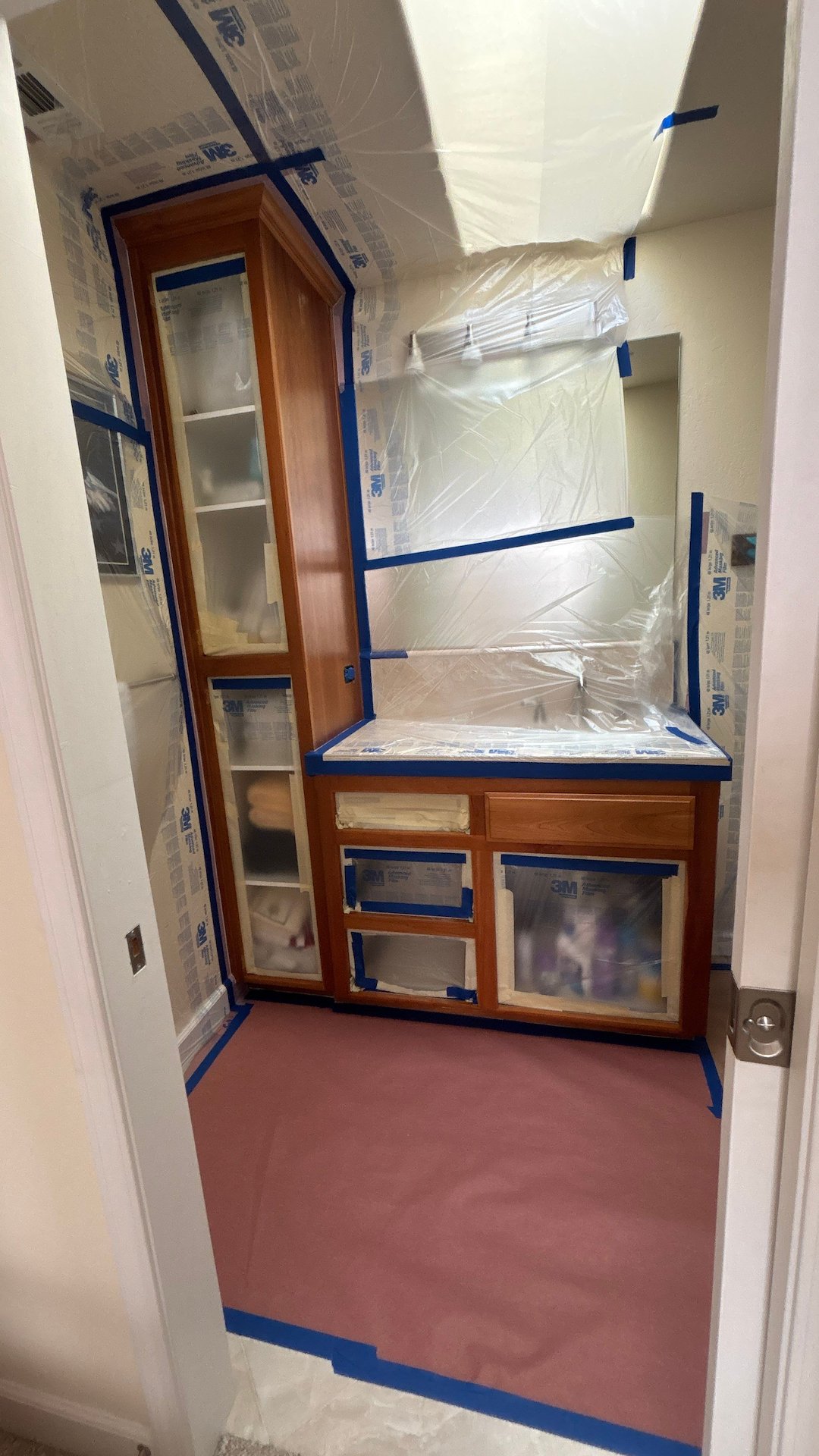 Because this was a compact space, preparation was especially important. Cabinets, countertops, floors, mirror, and lighting were fully masked and protected. The cabinet surfaces were thoroughly cleaned, lightly sanded, and primed to ensure a smooth, durable finish.