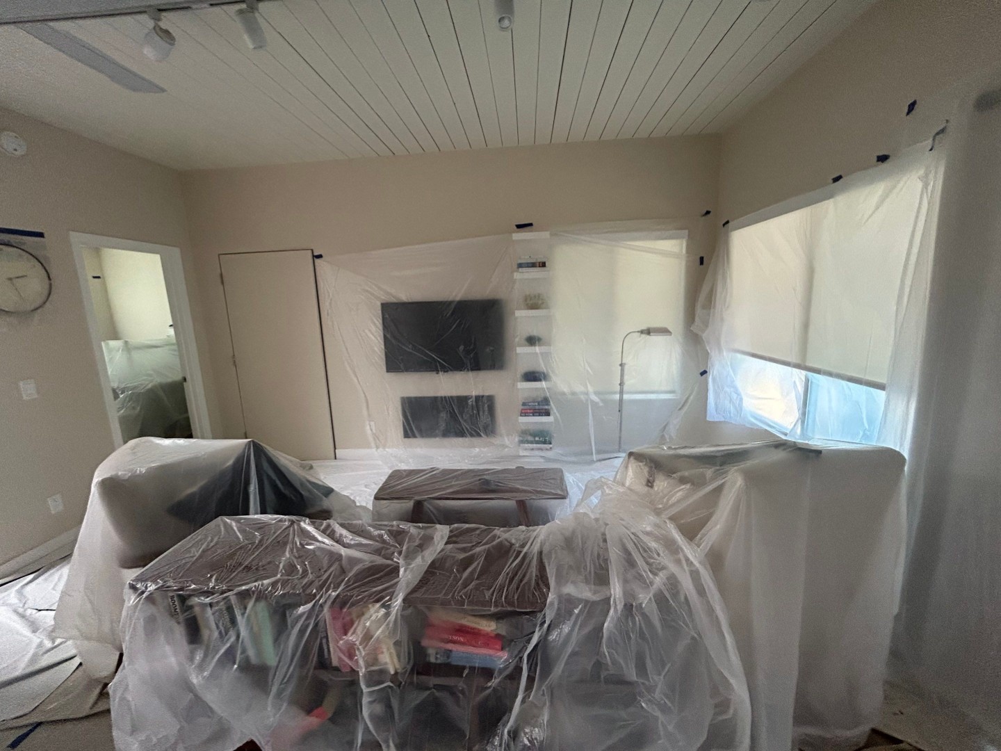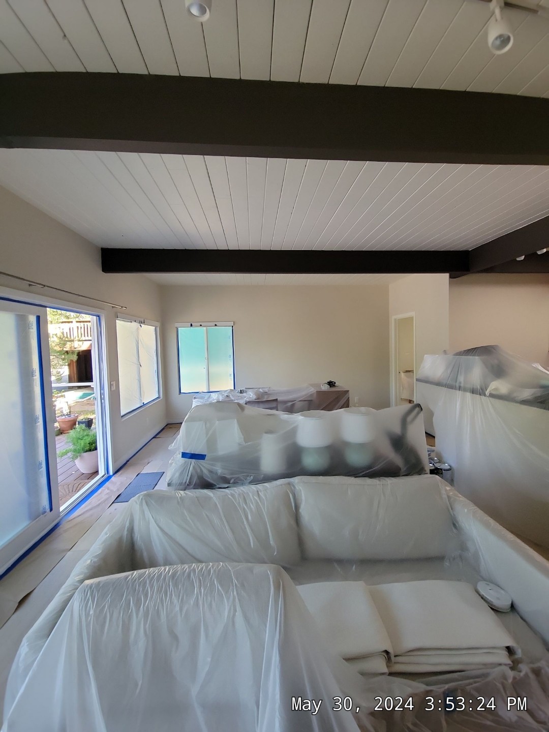 The Browder Painting team carefully covered all walls, furniture, and flooring before beginning prep. Each ceiling and beam was cleaned, sanded, and primed to ensure proper adhesion. Because the beams were dark, multiple coats of primer were applied before finishing with two coats of premium paint for a bright, even result.